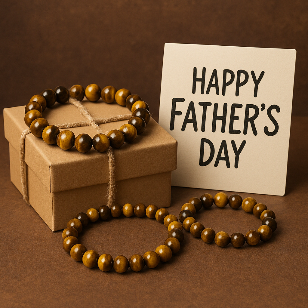 Deze set bestaat uit twee armbanden – één voor vader, één voor kind – gemaakt van gele tijgeroog: een natuursteen die staat voor bescherming, vertrouwen en verbondenheid.